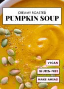 This dairy-free pumpkin soup would be a welcome addition to your holiday table. It would be equally at home with a soup or sandwich from fall through winter.