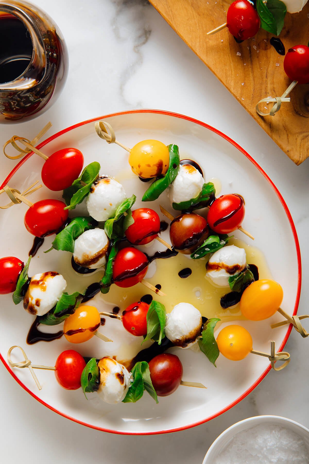 These caprese skewers are made with cherry tomatoes, basil and baby mozzarella balls with a balsamic vinegar and olive oil drizzle. Theyโre the perfect summertime party appetizer. Your guests will love this recipe! This recipe yields about 20 little skewers.