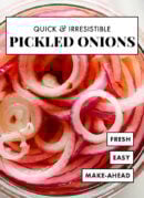 Learn how to make quick-pickled onions! This tangy and crisp pickled onion recipe is ready in 30 minutes. These onions are the perfect condiment for tacos, burritos, nachos, burgers and more. Recipe yields 2 cups.