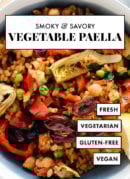 The best vegetable paella recipe! Itโs loaded with vegetables, chickpeas, and savory, smoky rice. This Spanish dish is perfect for serving at dinner parties, since itโs vegetarian, vegan and gluten free. Recipe yields 6 hearty servings.