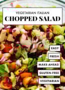 Truly the best Italian chopped salad recipe, with chopped fresh greens and veggies in a simple Italian vinaigrette. This salad is vegetarian and easily vegan. Recipe yields 6 to 8 side servings or 3 to 4 meal-sized servings (a lot). If you store the salad separately from the vinaigrette, it will keep well for up to 4 days.